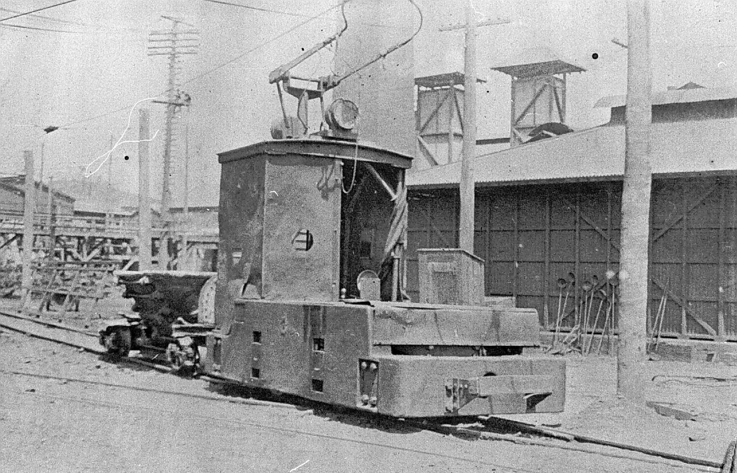 An electric tram pulling a truck at the sulphide works.