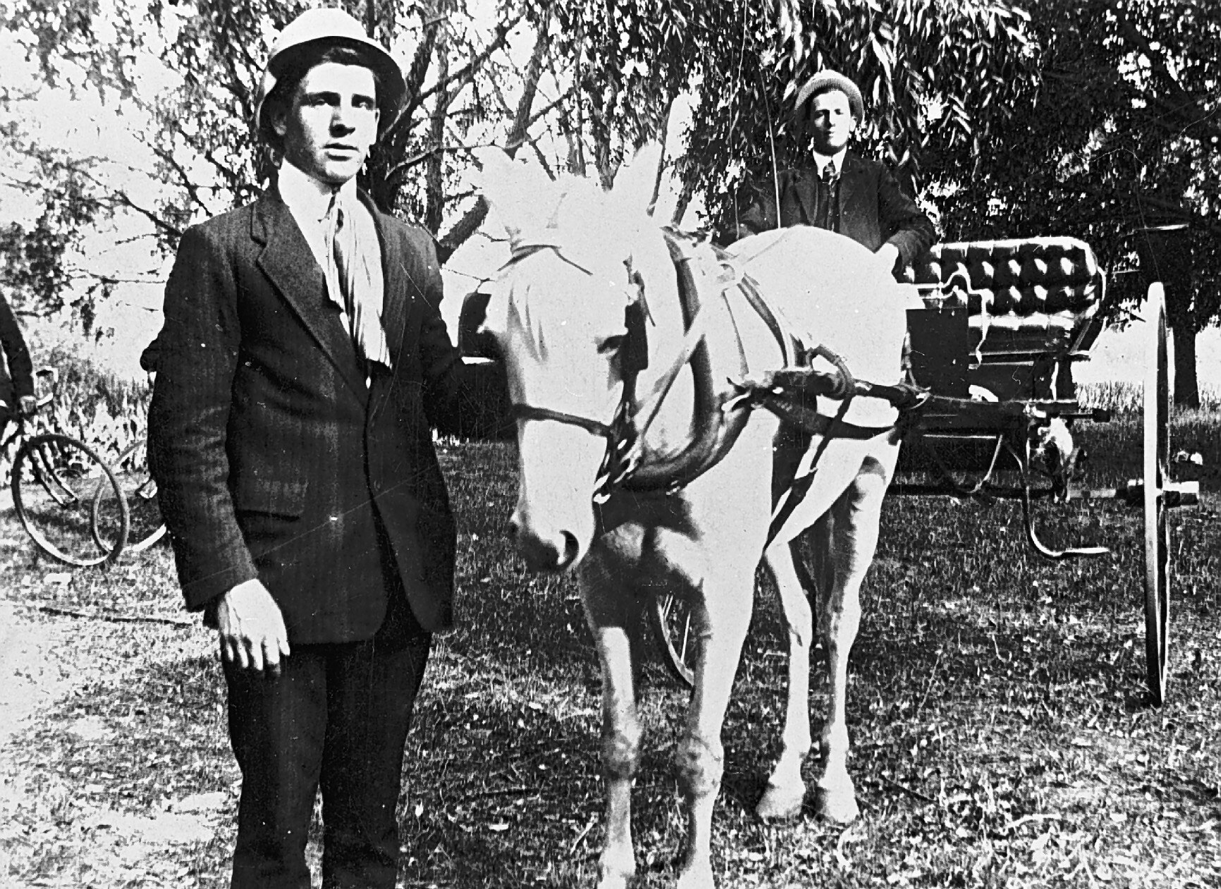 Two men with a horse and carriage. There are two bicycles on the left.