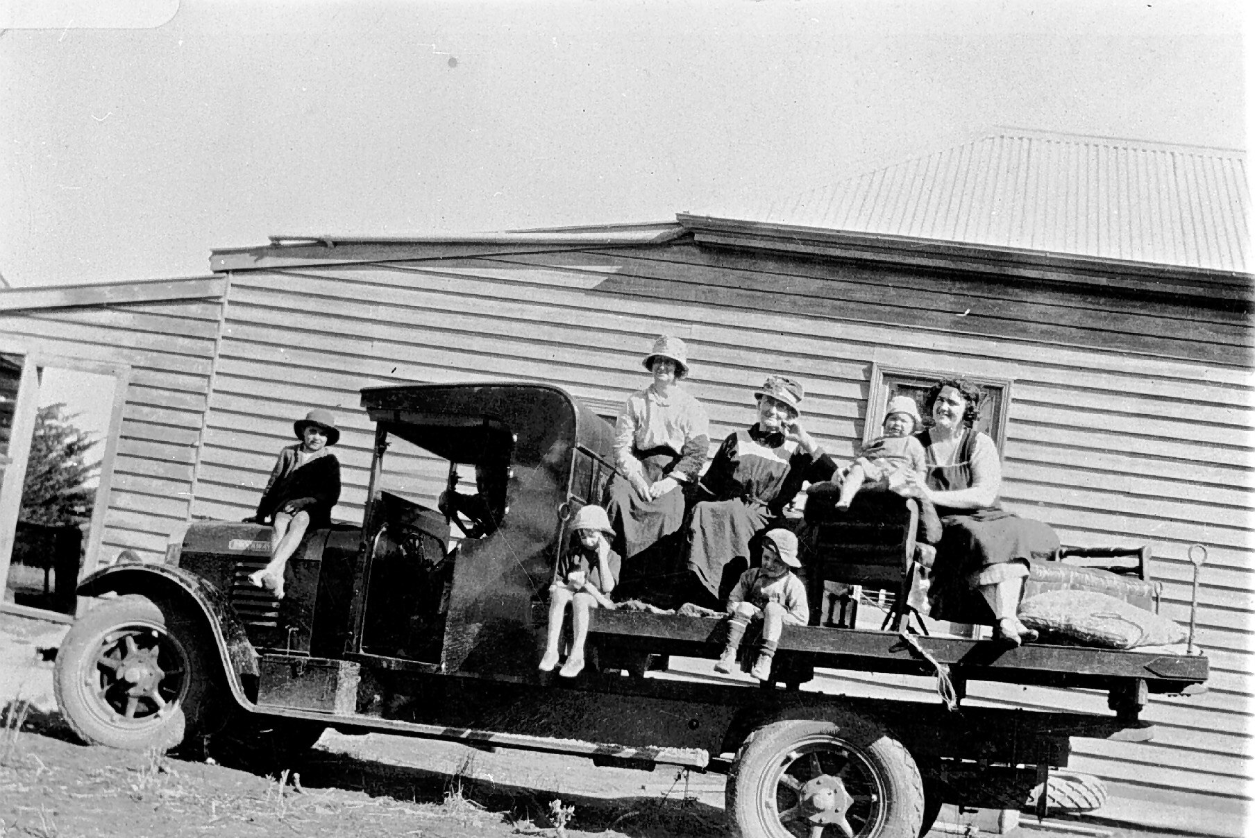 Women and children sitting on a Brockway truck.
