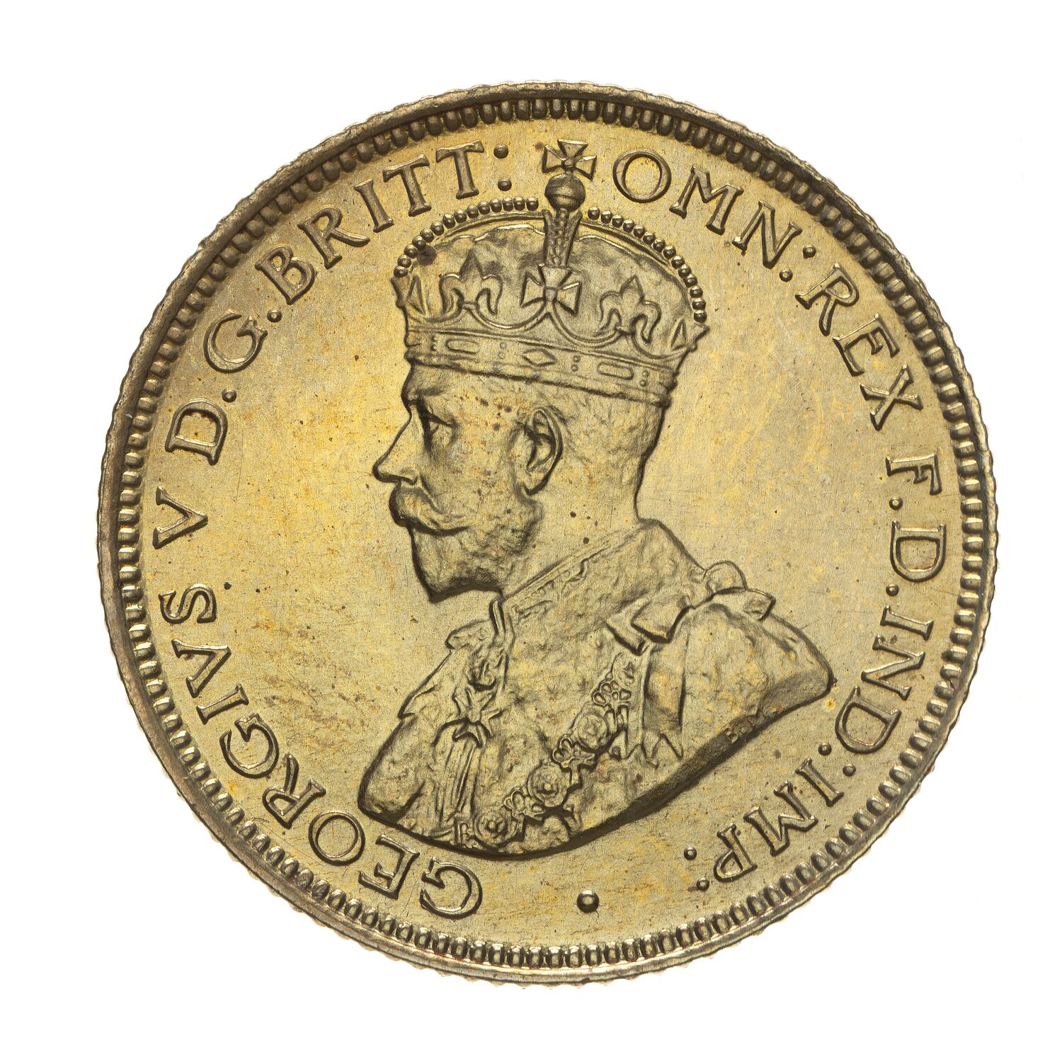 Crowned and draped bust of the King facing left, the King is wearing the Imperial Crown and the ermine Robe of State, the Collar of the Most Noble Order of the Garter, and the Badge of the Most Honourable Order of the Bath; around, GEORGIVS V D.G. BRITT: OMN: REX F.D. IND: IMP:; artist's initials BM on bust truncation