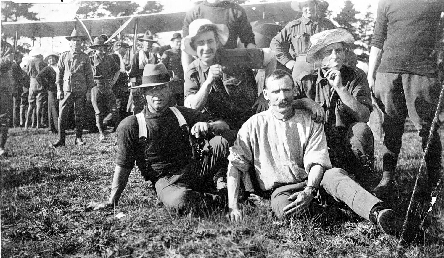 Photograph taken at Broadmeadows about 1914, showing soldiers sitting on the ground in front of a crowd inspecting a BE2a aeroplane, which was based at the Central Flying School at Point Cook.