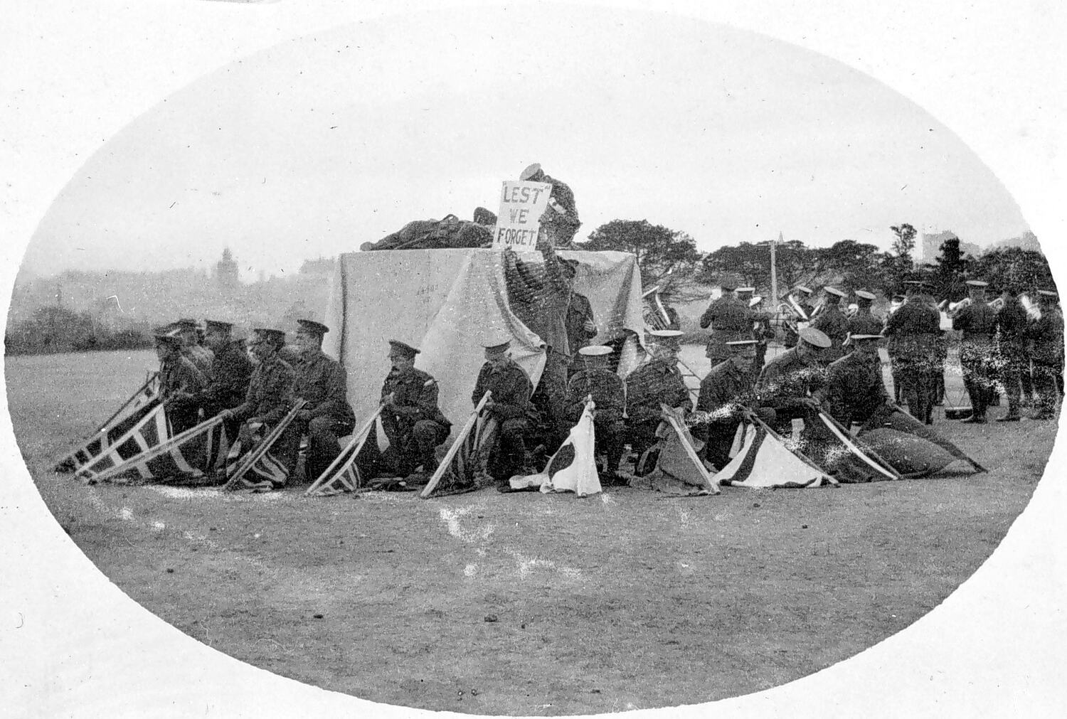 An Anzac Day ceremony. On a platform a soldier crouches beside a prone figure, a soldier next to the platform holds a sign reading 'LEST WE FORGET'. A number of soldiers around the platform crouch with their flags lowered. There is a band in the background.
