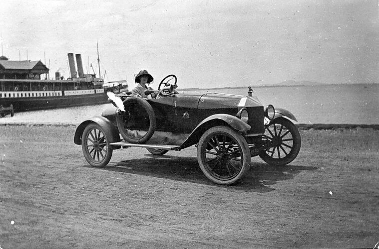 A woman in a Model T Ford roadster. There is a ship at a pier in the background.