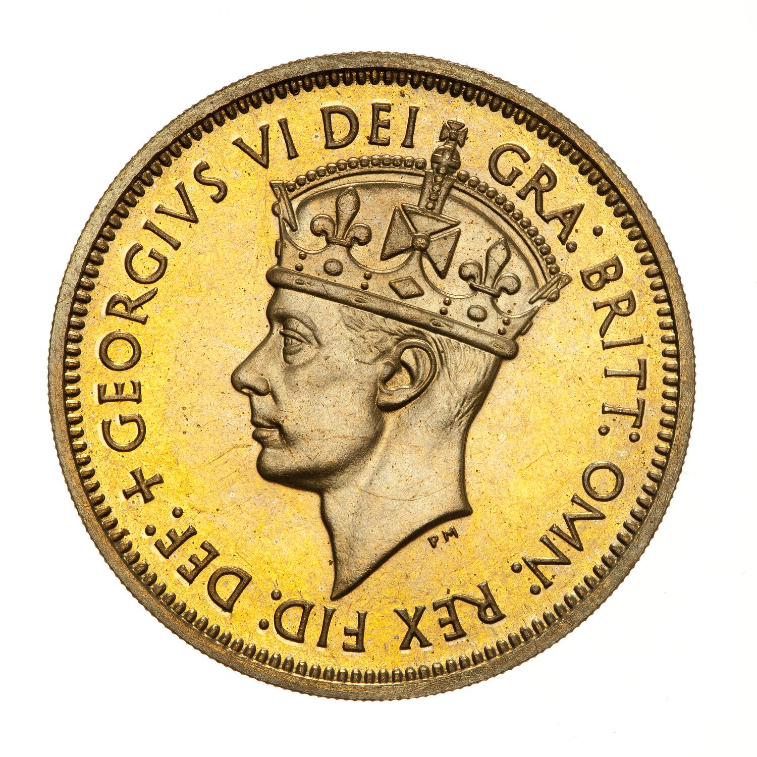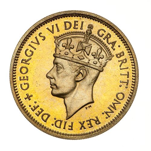 Crowned head of the King facing left; around, GEORGIVS VI DEI GRA: BRITT: OMN: REX FID: DEF:, the artist's initials, PM, in relief below neck truncation