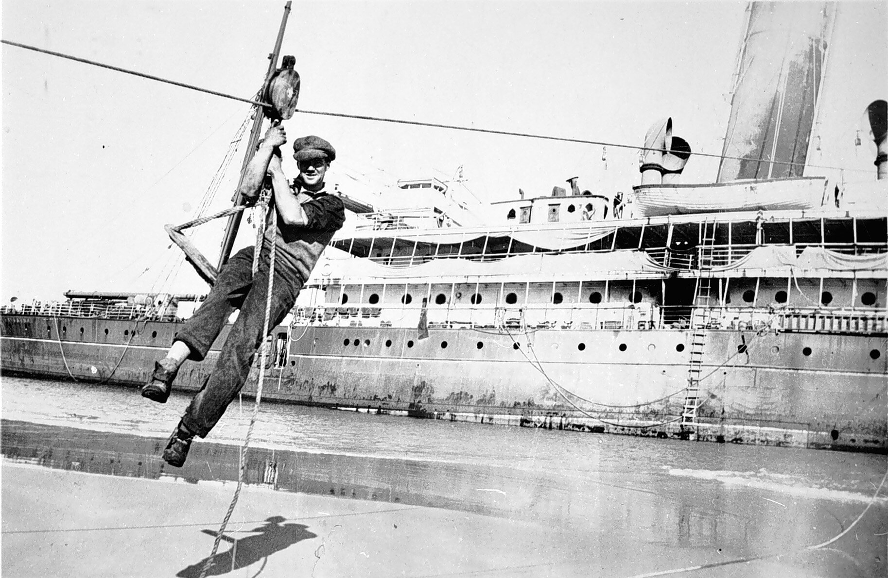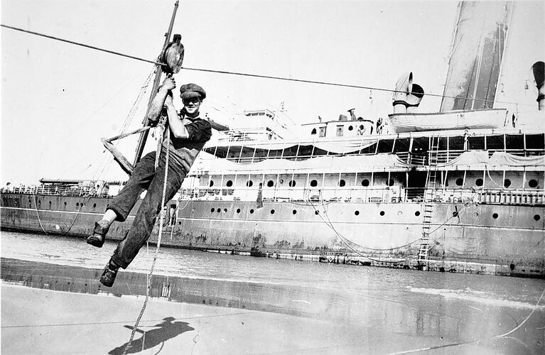 A man travelling from beach to ship in a bosun 's chair. The ship, the SS Riverina had run aground. (see also MM 004439).