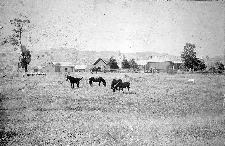 The homestead on 'Milton Park' station. There are four horses in the foreground and a flock of sheep in the background.