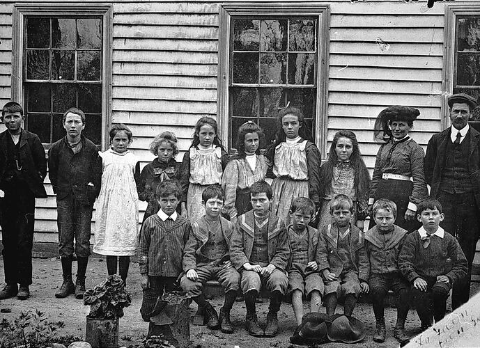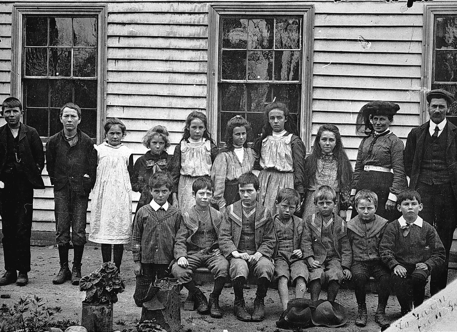 Teachers and pupils outside a school. There is an inscription 'To Gwen from. G..?' on the bottom right corner. Four of the boys wear similar clothing.