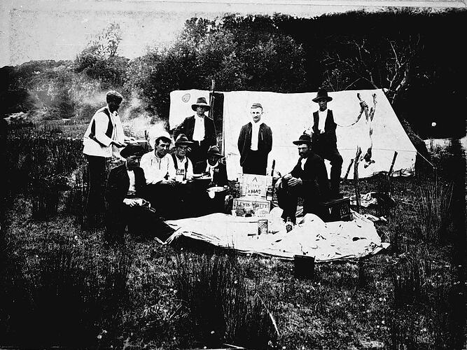 A group of men in a camp. They are gathered around a cloth spread on the ground on which there is food. There is a campfire in the background and a man on the left appears to be serving food. A sign on a box reads: A Merry Xmas. There is a tent behind.