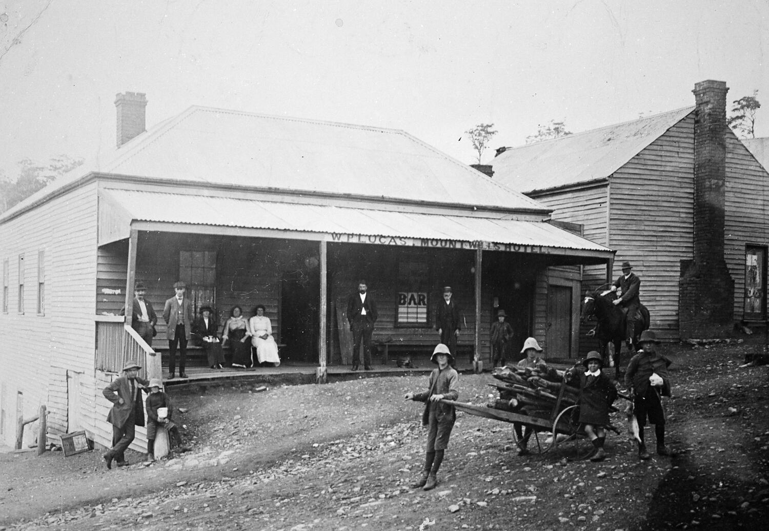 People in front of W.P. Lucas' Mount Wills Hotel. A boy is pulling a cart laden with wood at the right.