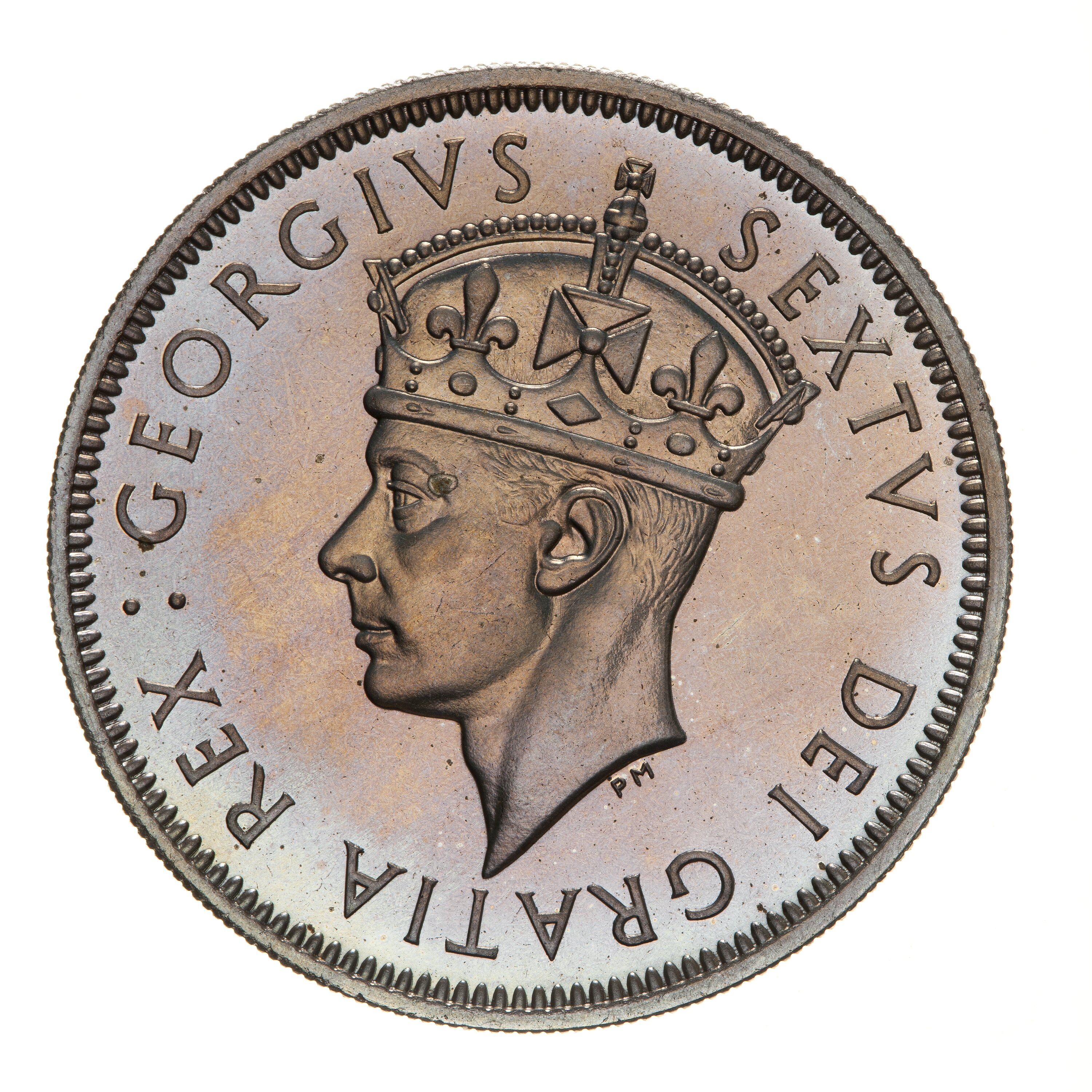 Crowned head of George VI facing left; around, GEORGIVS VI DEI GRATIA REX:; the artist's initials, PM, below the neck truncation
