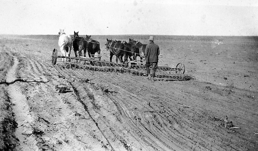 A man with a scarifier drawn by six horses. This was on 'Hillcrest' farm.