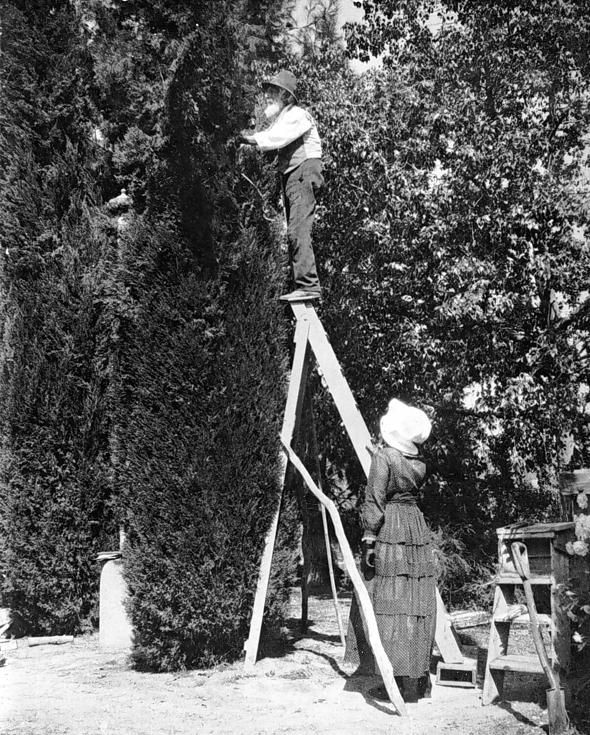 An elderly man trimming a cypress tree. He stands precariously on the top step of a ladder which is being held by a woman.