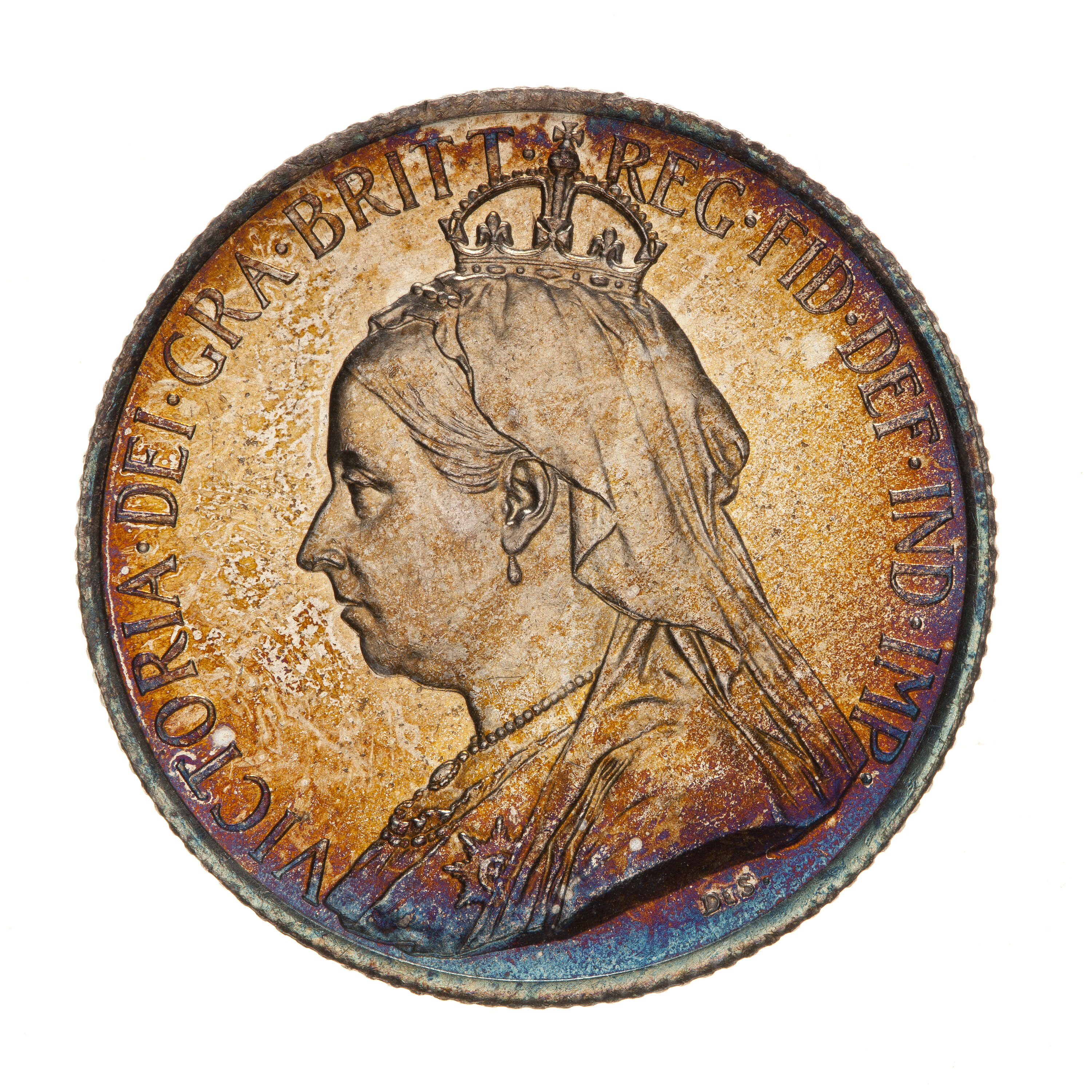 Crowned bust of Victoria left; around, VICTORIA DEI GRA BRITT REG FID DEF IND IMP