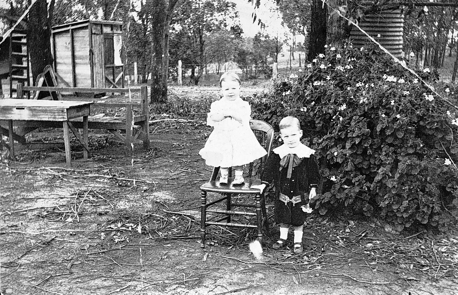 Two small boys in the backyard of Parkin 's General Store. The boy standing on a chair wears a dress while the other boy is in a dark suit with a wide collar and tied bow. There is a rustic table and chair on the left.