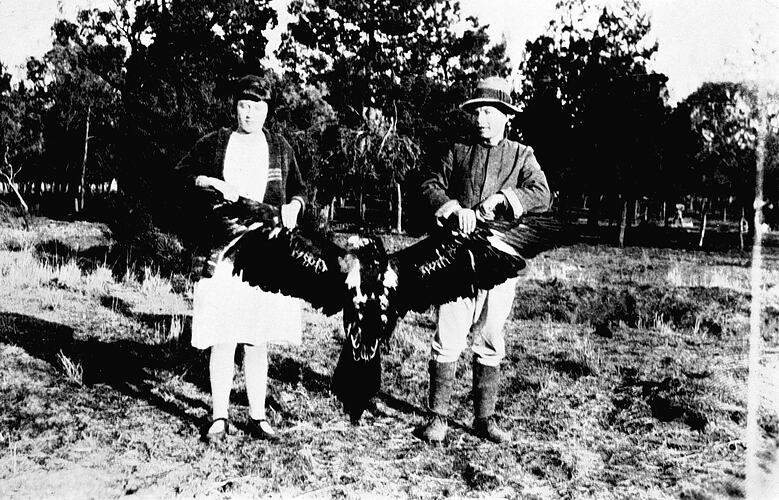 A boy and girl holding a dead eagle.