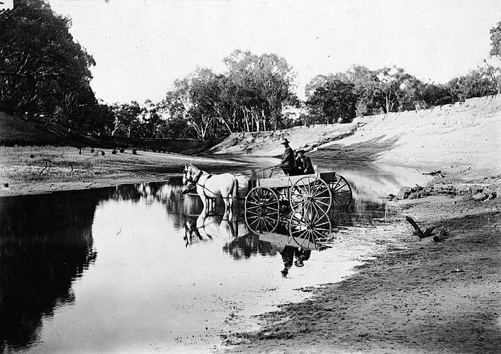 Two men fording the Darling River in a horse and carriage. They are on 'Balcatherine' station.