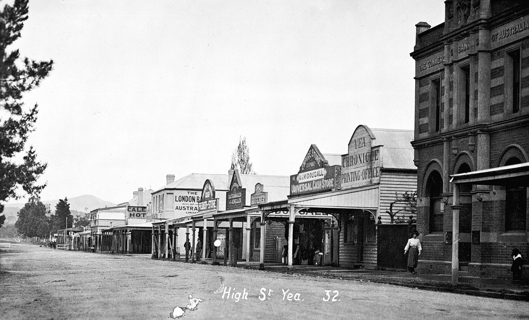 High Street, Yea with the Caledonian Hotel, the London Bank, the Yea Chronicle Printing Office and the Universal Cash Store.