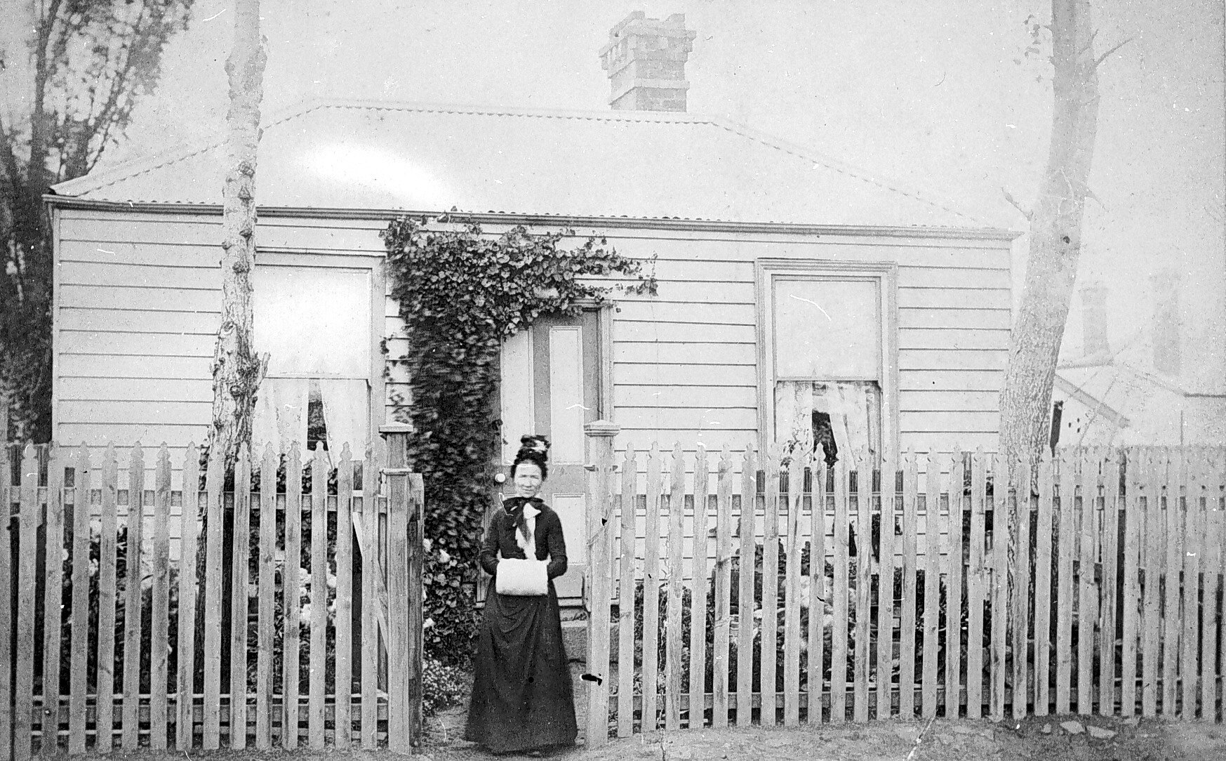 Negative of Ellen Carson, outside what was probably her family home. According to Sands & McDougall Directories, John A Carson lived in Victoria Street Footscray at this date.