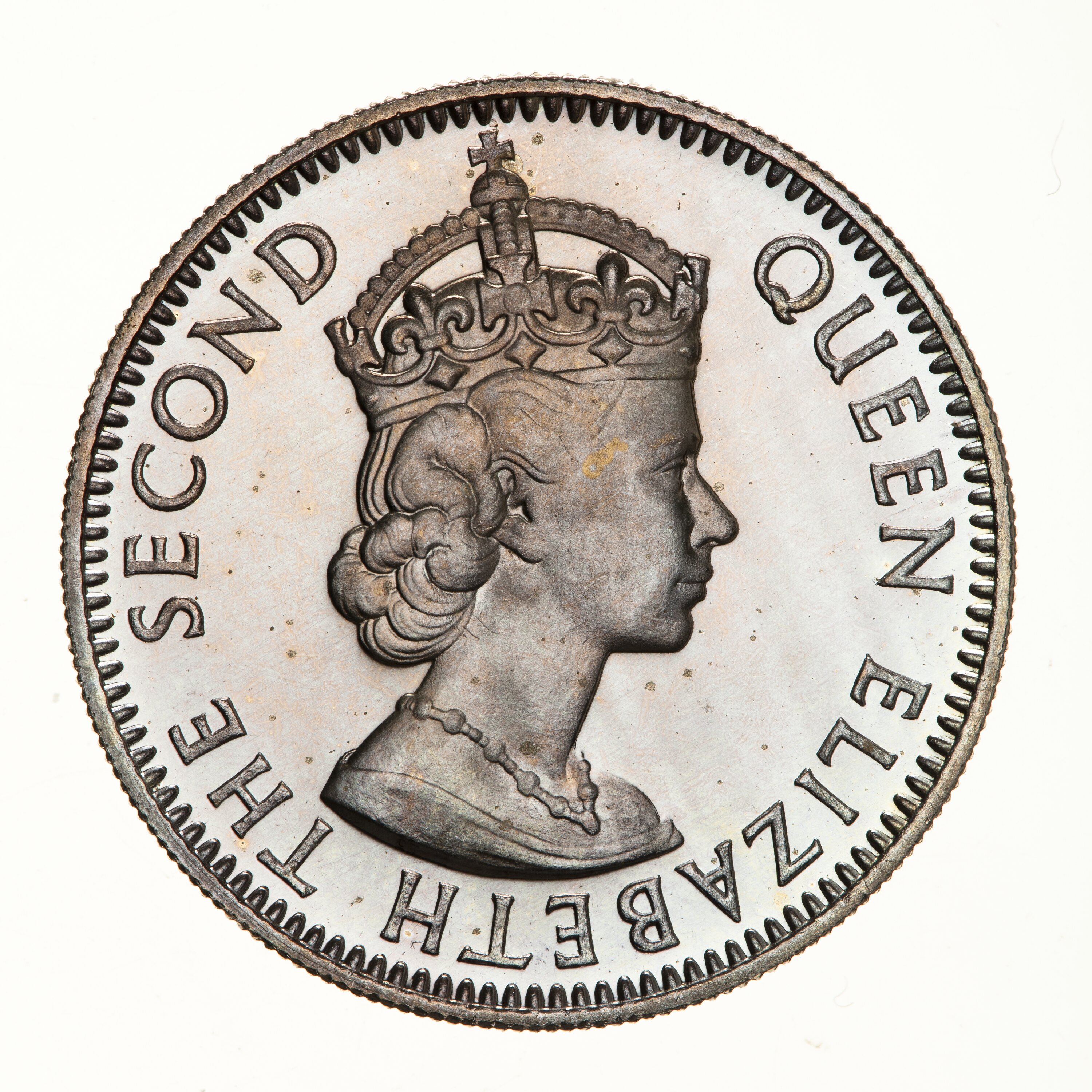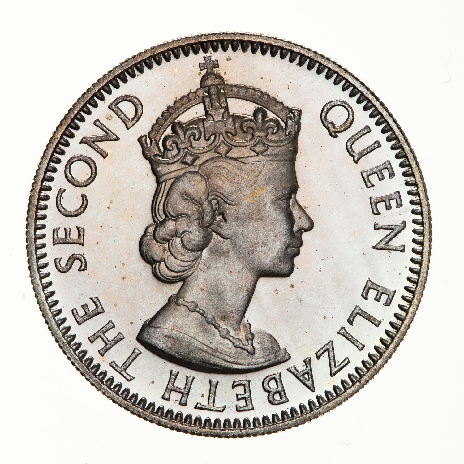 Crowned bust of Elizabeth II right; around, QUEEN ELIZABETH THE SECOND, the artist's initials, CT, incuse on neck truncation