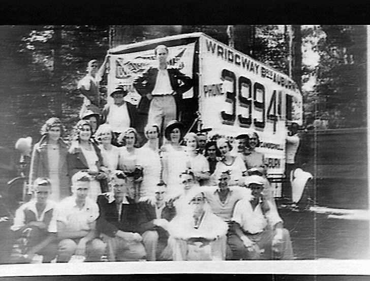 Members of the Waratah Social Club of Wridgeway Brothers at a trade union picnic. They are grouped behind a Wridgeway Brothers delivery van.