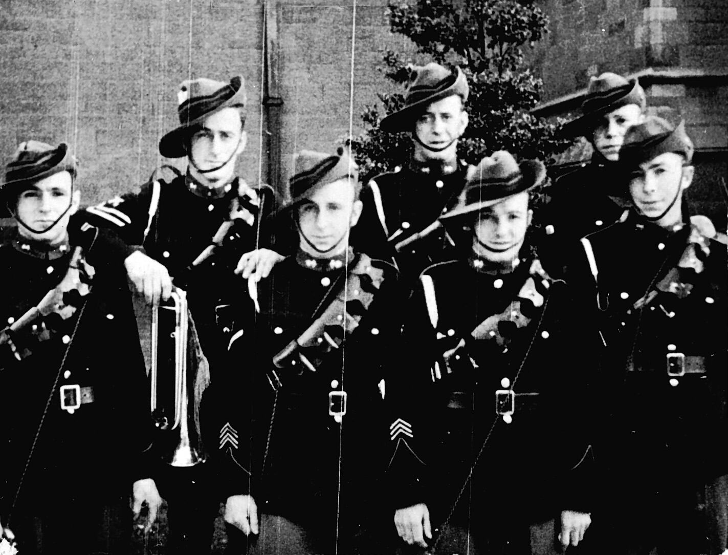 A group of soldiers of the Victorian Militia outside St Pauls Cathedral. One carries a trumpet.