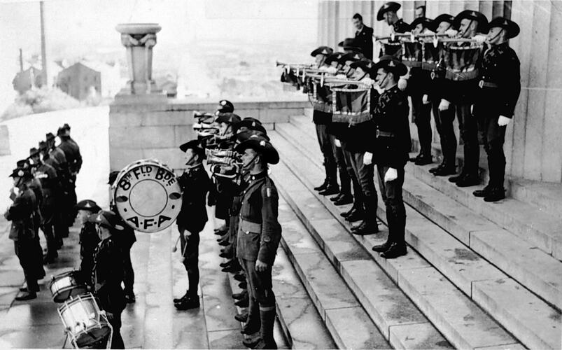 Soldiers of the Victorian Militia on the steps of the Shrine of Remembrance. There are three rows of buglers with drummers in front. The sign on the side of the bass drum reads '8th FLD BDE A.F.A.'.