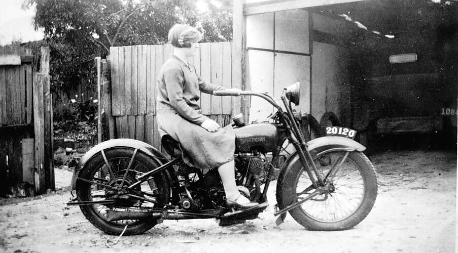 A woman on a Harley Davidson motorbike in front of a garage.