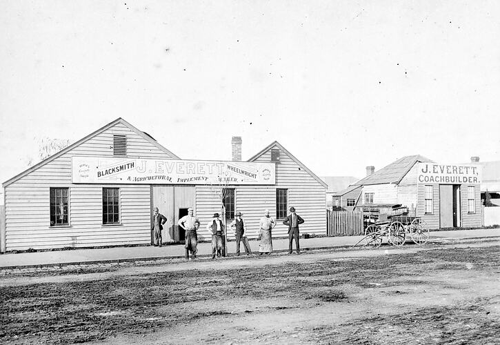 Men standing in front of the factory of J. Everett, Coachbuilder, Blacksmith and Wheelwright.