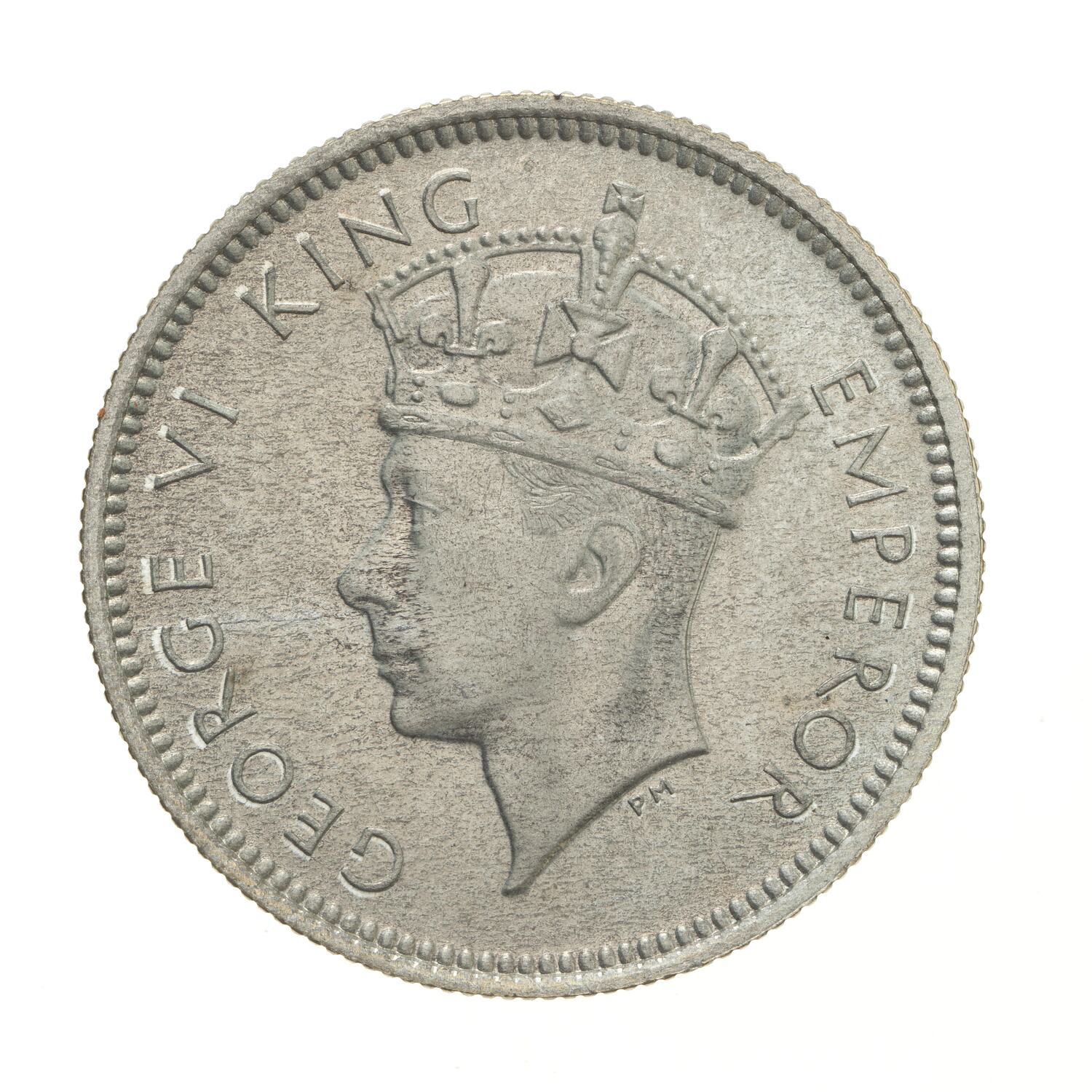 Crowned head of the King facing left; around, GEORGE VI KING EMPEROR; the artist's initials PM, in field below neck truncation
