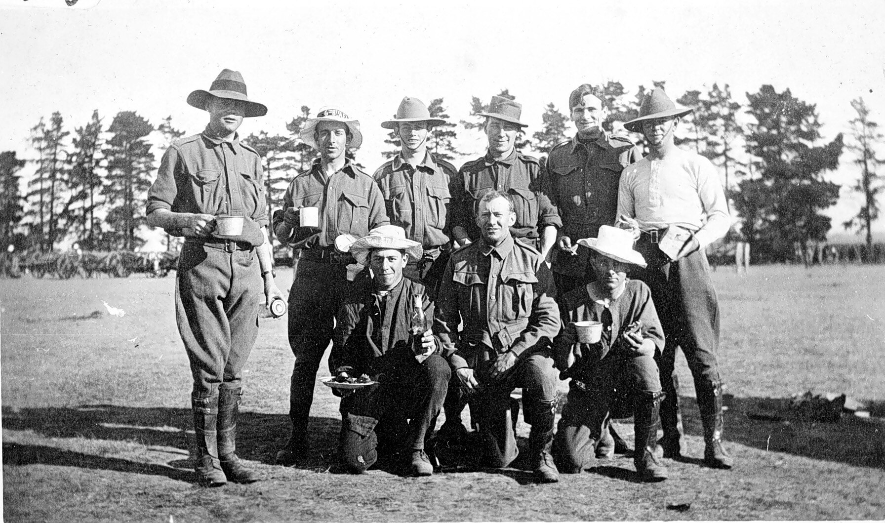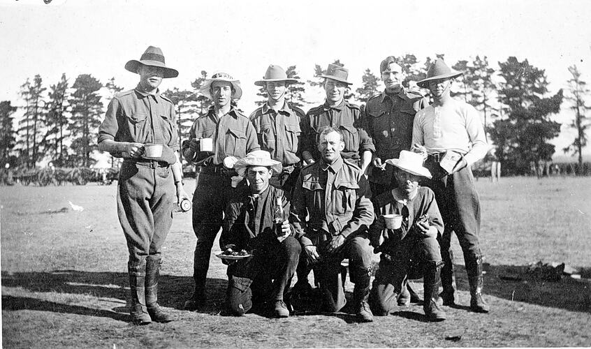 A group of soldiers holding mugs and food. One wears a cap labelled '6th-8th AFA...'.
