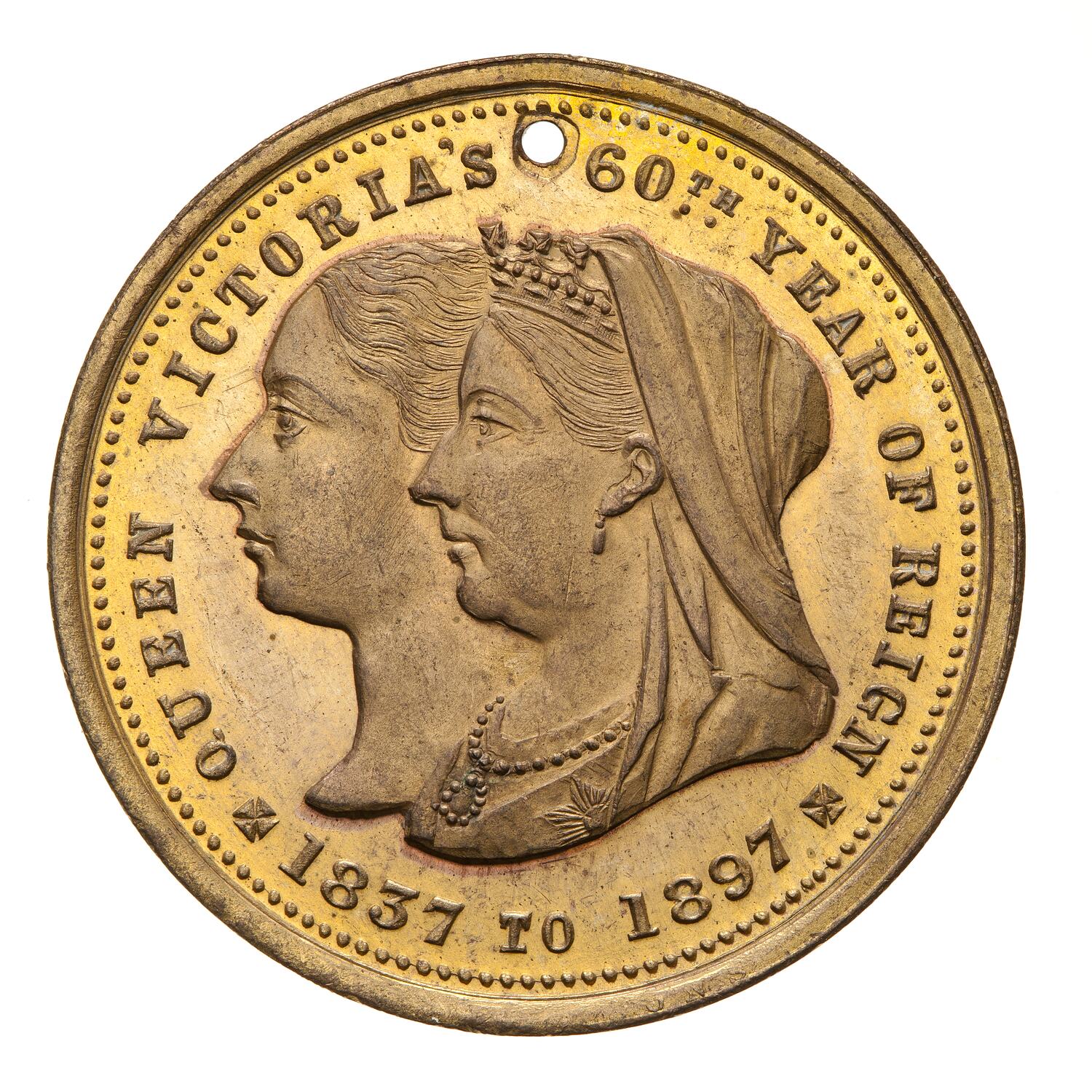 Conjoined bust of Queen Victoria as young woman and as she was in 1897; around, QUEEN VICTORIA'S 60TH YEAR OF REIGN 1837 TO 1897
