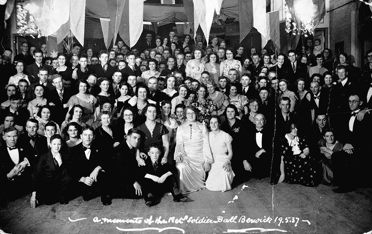 A group portrait of men and women at a returned soldiers ball.