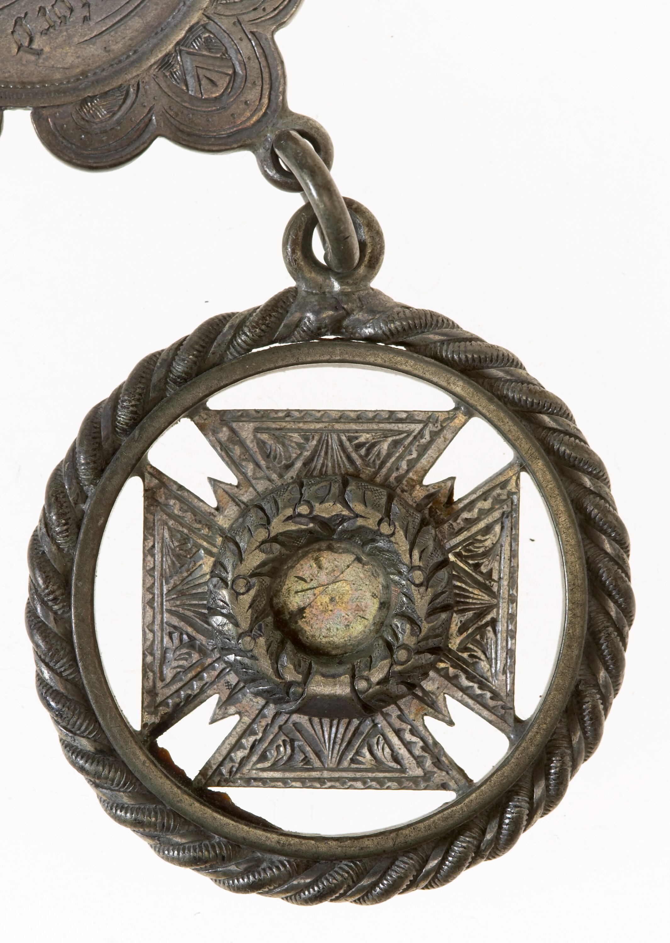 Back of cross engraved, Presented by / C.U.V.F.B. / TO / P. O'CONNELL / for Valuable / Services rendered / 1 Nov. 1886