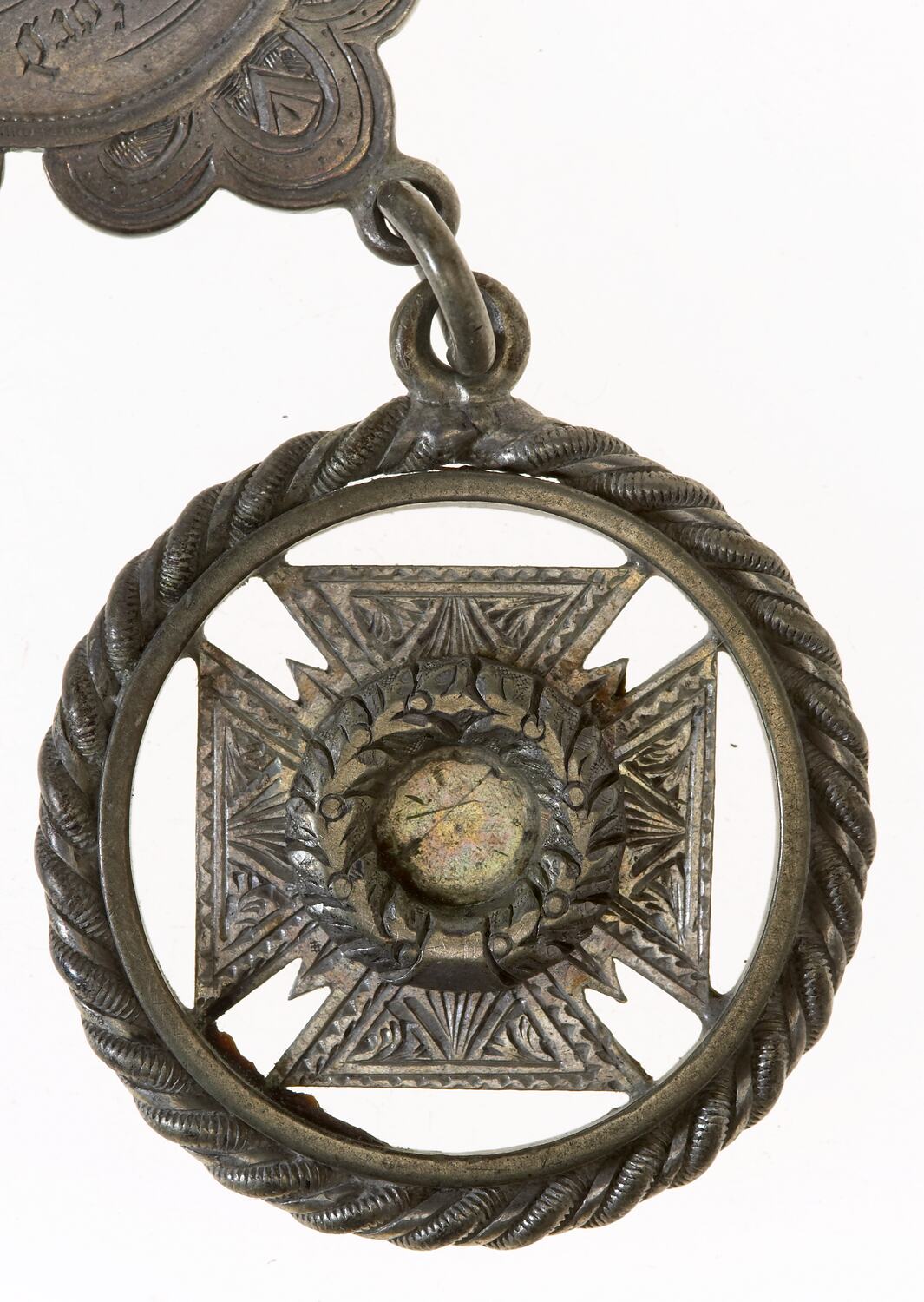 A hand made cross set in a ring engraved with details of the award.