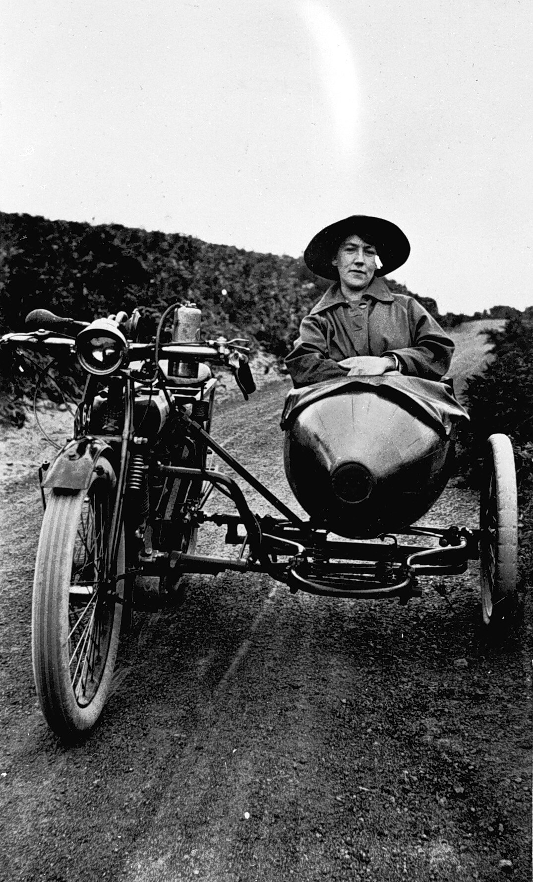 A woman in the sidecar of a motor bike.