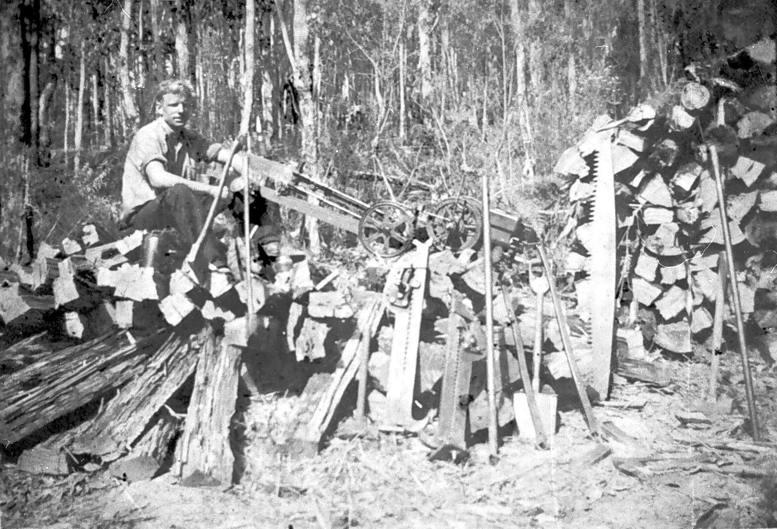 A man with a stack of wood and a selection of logging tools including an auto logger.