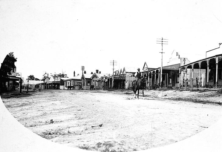 A man on horseback in the main street in Orbost Buildings include Andrews, Tailor, and the Joyce Billiard Saloon.