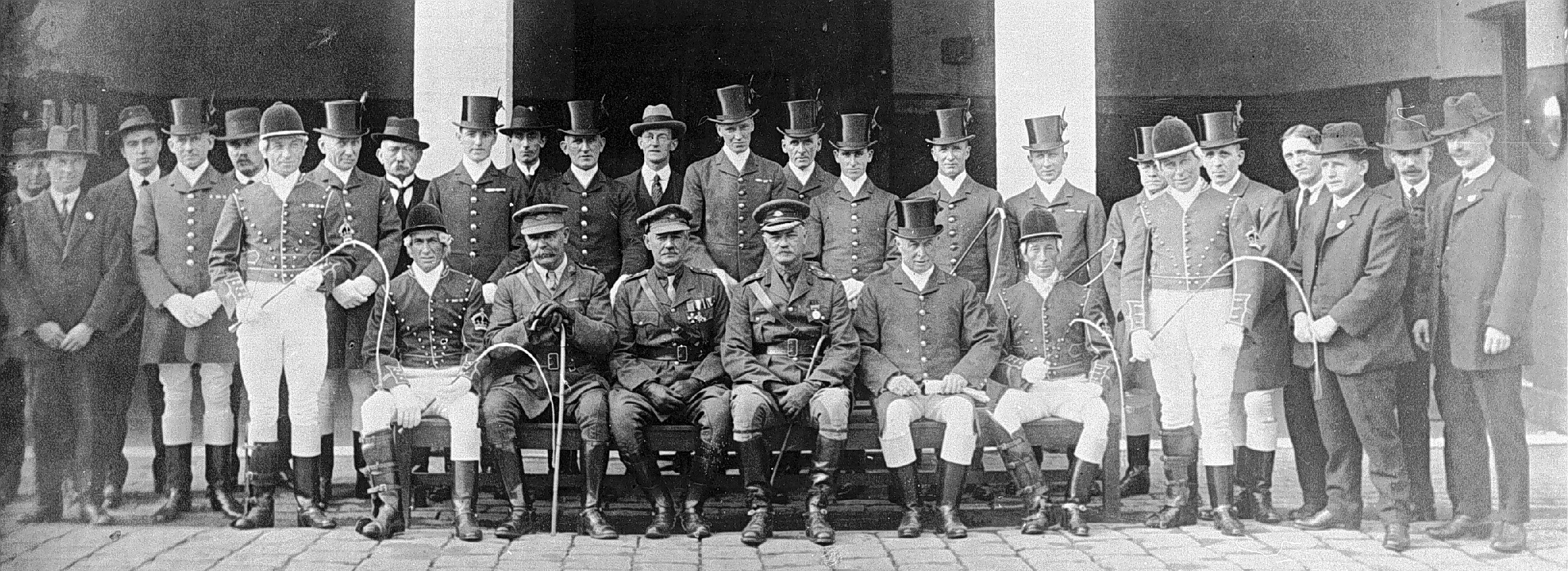 Officers and staff in charge of horses. Carriages and transport during the visit of H. R. H. The Prince of Wales. They are in front of the stables at Government House.