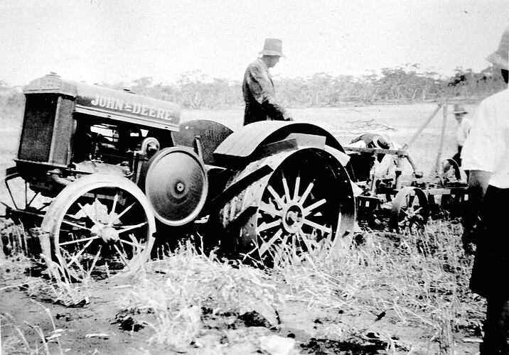 A tractor trial. A John Deere tractor is under inspection.