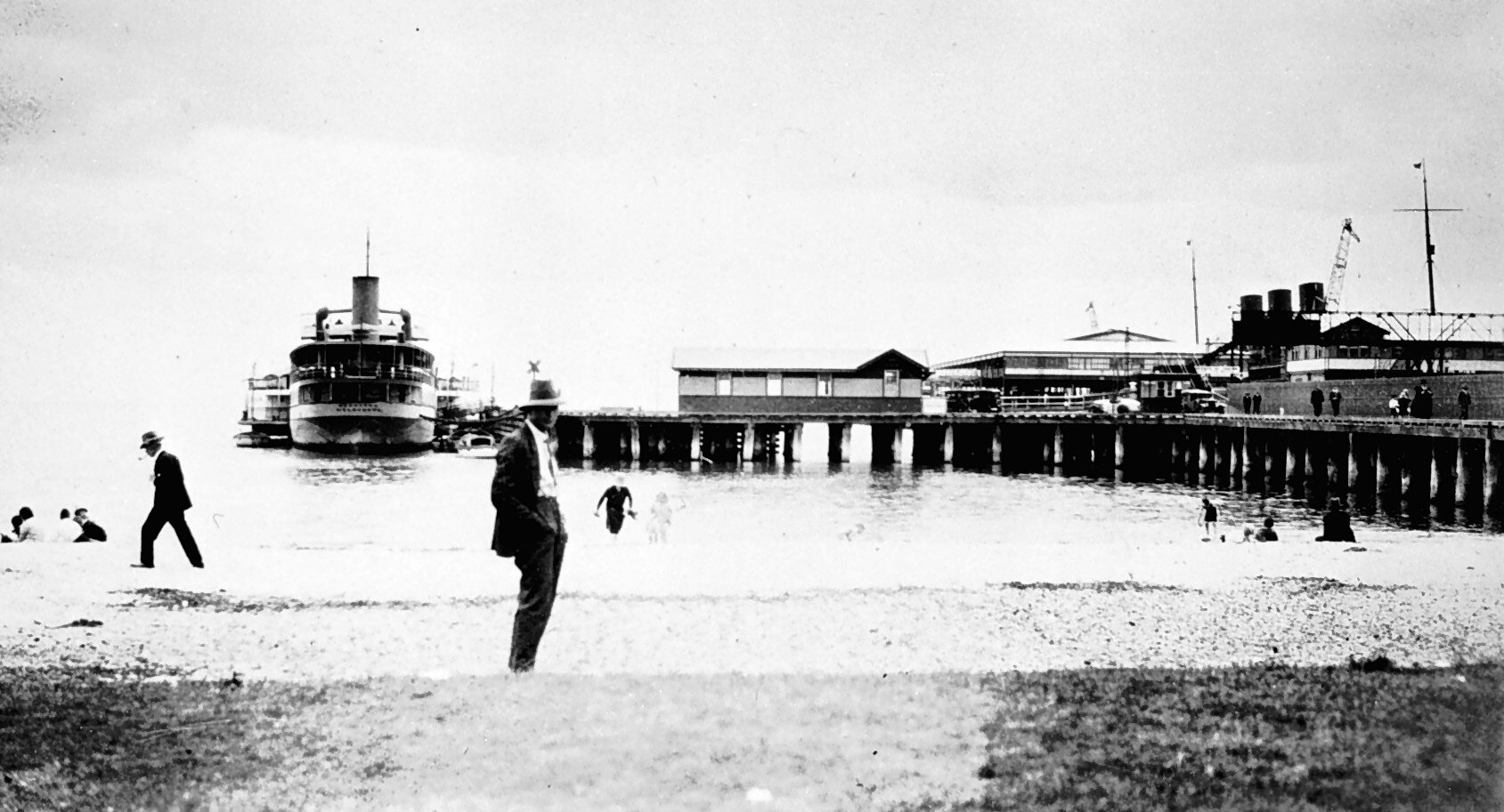 The SS Weeroona at a pier in Port Melbourne. There are people swimming off the beach.