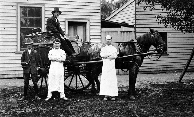Bakers of the T. Blight Bakery with the delivery cart. The bakery is behind them and tea rooms are on the right.
