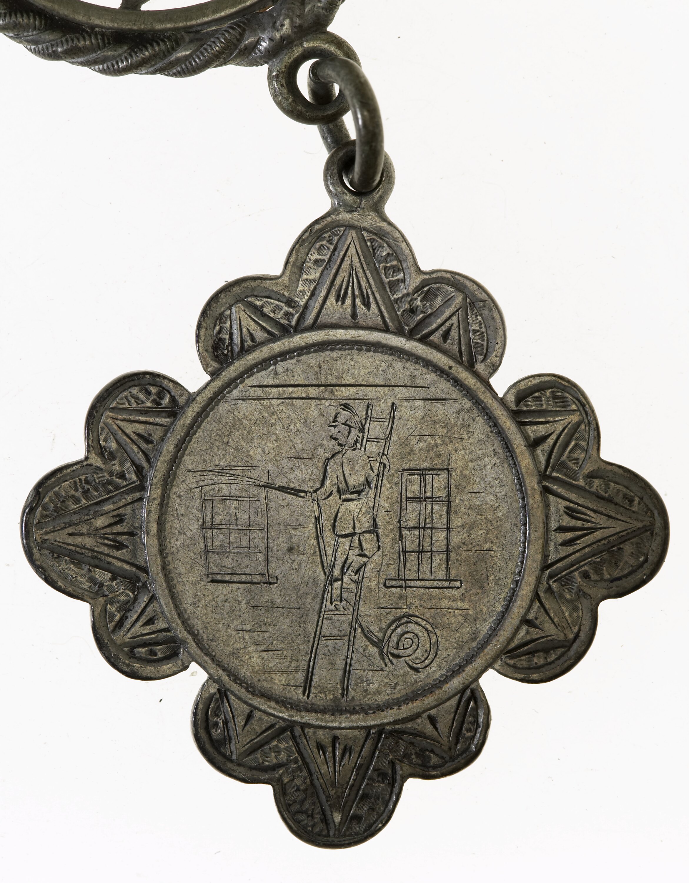 On circular centre hand engraved, a fireman standing on a ladder hosing a window on his left