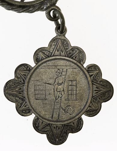 A hand engraved silver medal featuring a Fireman standing of a ladder hosing a window and naming the winner of the 1886 Ladder and Hose competition at Daylesford, P.O'Connell