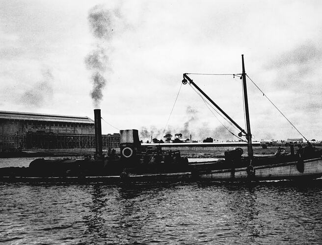A steam-powered works boat with a tall funnel and a large forward mounted derrick. Possibly on the Yarra river.