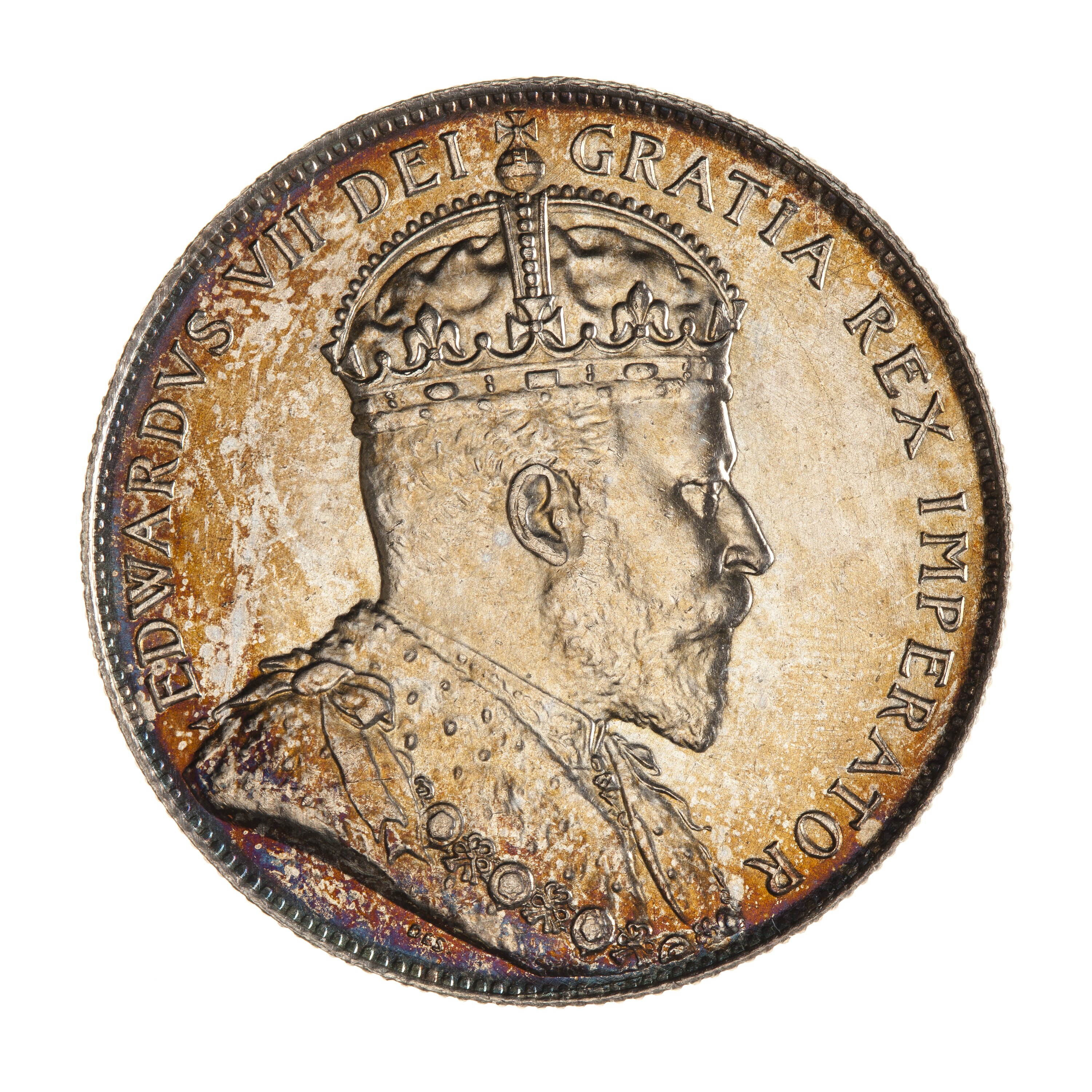 Crowned and draped bust of the King facing right; around, EDWARDVS VII DEI GRATIA REX IMPERATOR; the artist's initials, DES, in field below bust