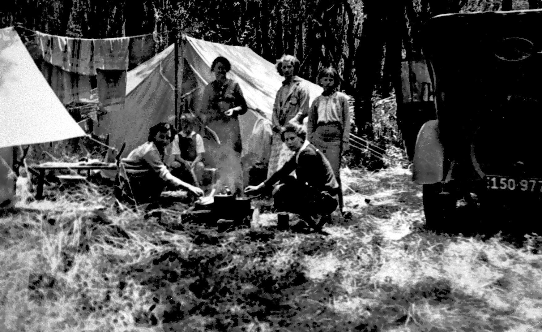 The Johnston family camping on the foreshore at rosebud. They are grouped around a camp fire, there are tents on the left and a car on the right.