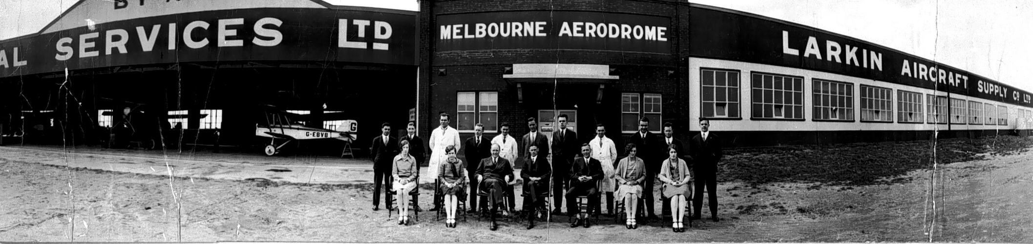 A panoramic view of workers outside the Larkin Aircraft Supply Company Limited. (LASCO) at Coode Island. Visible inside the hangar is a SE5a with the British registration G-EBVB, belonging to the UK firm Savage Skywriting Co. Ltd. In March 1928, two of Savage's SE5a aircraft and pilots were brought to Australia to demonstate skywriting as an advertising technique and were based at Coode Island during their stay in Melbourne. The first official demonstration over Melbourne was flown by George A. Lingham DFC on 14 April 1928 when he wrote 'HELLO' at about 12,000 feet in letters seven miles long. Lingham, who was born in Melbourne had practised for his display the previous day over Sunshine. Soap manufacturer Lever Bros contracted the aircraft to write 'LUX' over Melbourne and Sydney but other work was scarce and the two SE5a aircraft were shipped back to the UK on 28 December 1928. 'Jimmy' Larkin is seated third from the right.
