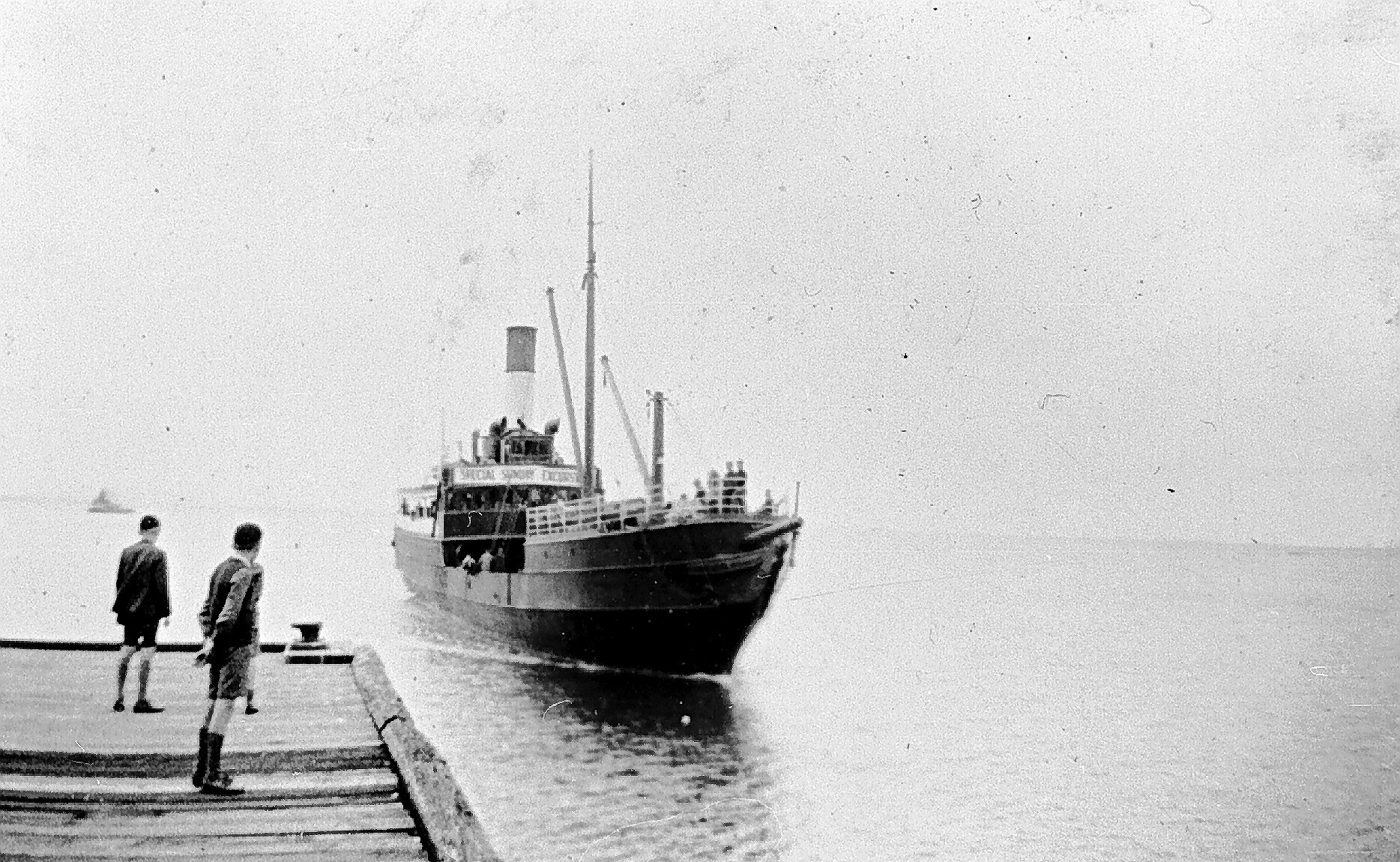 The steamship 'Edina' approaching the pier at Geelong. Two schoolboys are waiting on Cunningham Street Pier. There is a banner across the deckhouse of the 'Edina' below the bridge which reads 'SPECIAL SUNDAY EXCURSION'.