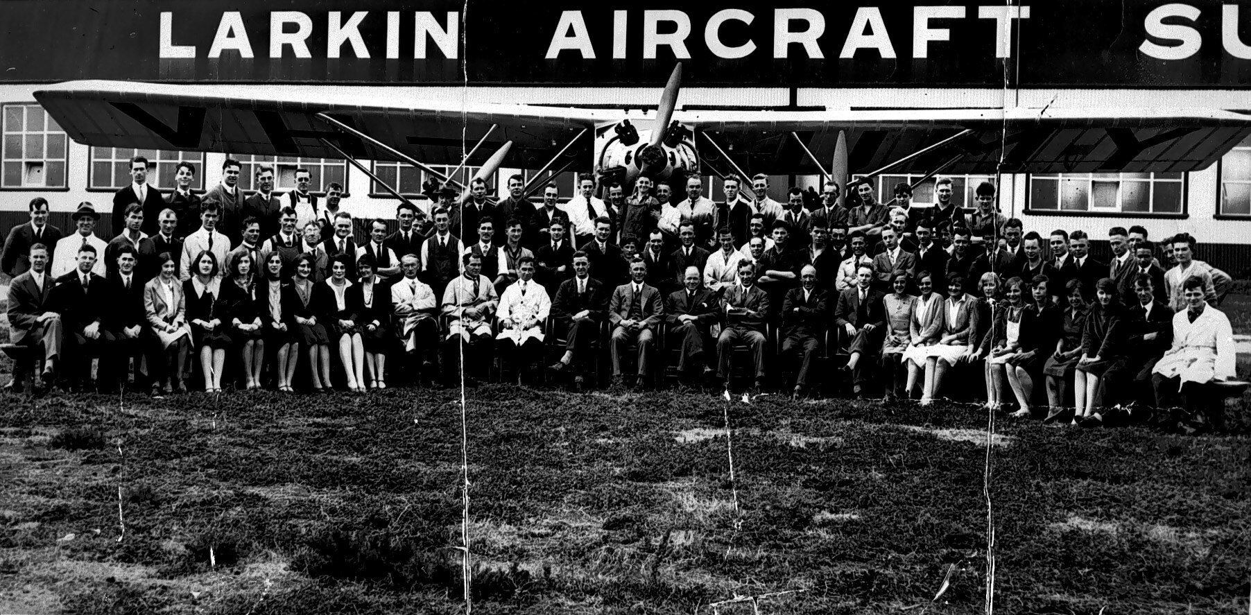 A large group of employees at the Larkin Aircraft Supply Company Limited on 9 May 1930. The aeroplane is Lascondor VH-UMY which was built by LASCO and designed by W.S Shakleton. It was first flown at Coode Island on 23 March 1930. This was the first three-engined aircraft to be built in Australia but was not put into production. For names see K.R. Meggs 'Australian-Built Aircraft & The Industry, Vol 1, page 181