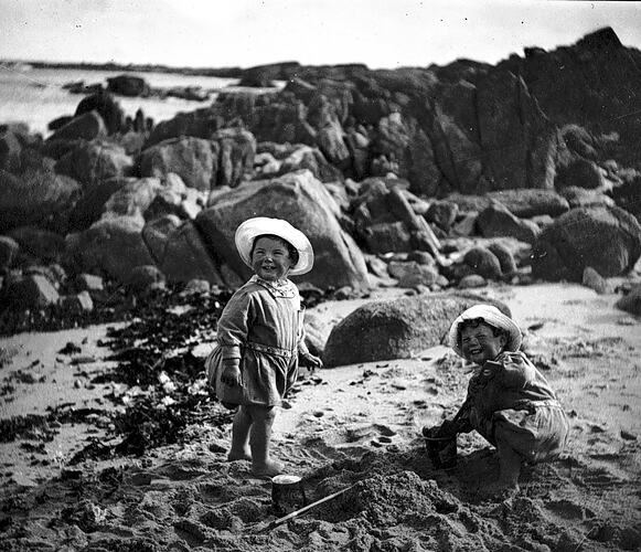 Two small girls at the beach. They have buckets and spades and are in a sandy space with a rocky outcrop behind them.